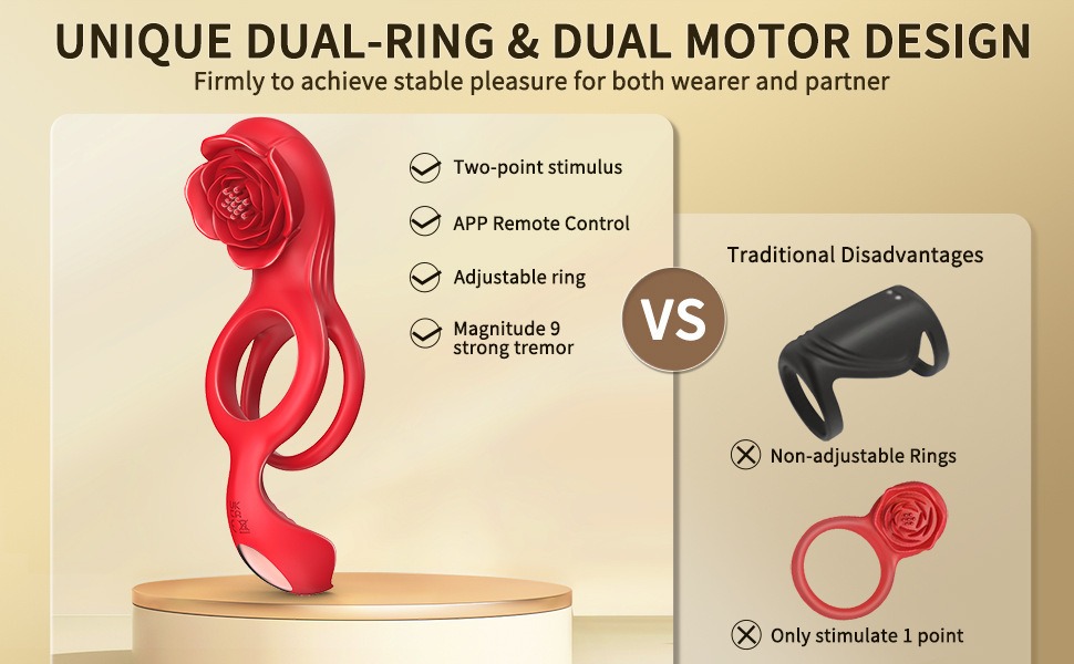 2 Motors 9 Vibrations - This rose-inspired penis ring with 2 motors offers 9 tantalizing patterns for clit stimulation and 9 powerful testicle vibrations to pldge explosive pleasure every time.